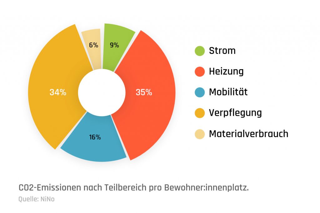 Abschließend kann festgehalten werden: Weniger Verbrauch heißt immer auch weniger CO₂-Aufkommen und senkt zudem die Nebenkostenabrechnung. Besonders wirkungsvoll sind Maßnahmen im Bereich der Verpflegung und des Materialverbrauchs: Durchschnittlich 41 Prozent der Gesamtemissionen entfallen auf diese Teilbereiche, zu denen auch Reinigungsmittel und Pflegematerialien zählen.